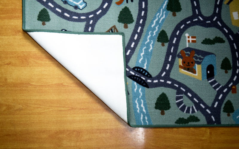 Mac City Map carpet is designed for children with a printed city layout that helps them explore with their cars, trains, and imagination. It encourages interactive play as they drive, stop, and create stories based on the illustrated streets and buildings.